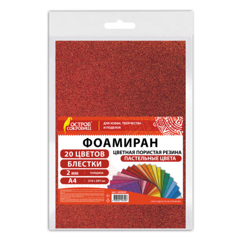 Пористая резина/фоамиран А4, 2 мм, НАБОР, 20 листов, 20 цветов, пастельные цвета, блестки, ОСТРОВ СОКРОВИЩ, 665665 |
