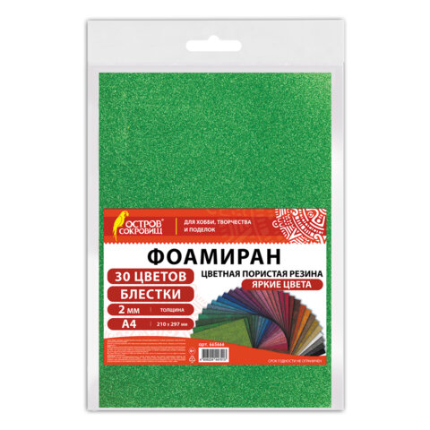 Пористая резина/фоамиран А4, 2 мм, НАБОР, 30 листов, 30 цветов, яркие цвета, блестки, ОСТРОВ СОКРОВИЩ, 665666 |