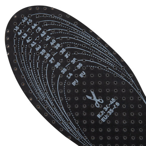 Стельки для обуви с российским размером RU 34-45, что соответствует европейскому размеру EU 35-46. На стельках указаны оба стандарта размера: RU и EU, а также нанесены линии выреза. Для удобства на упаковке приведена таблица соответствия размеров RU/EU.