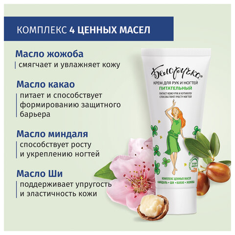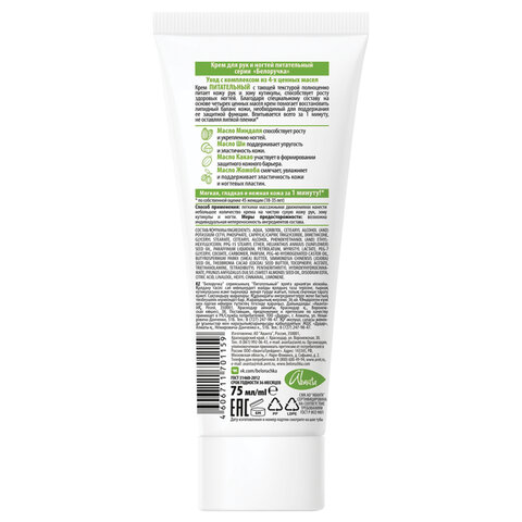 Состав: вода, сорбитол, воск эмульсионный, каприлик/каприк триглицерид, диметикон, глицерилстеарат, цетеариловый спирт, феноксиэтанол и этилгексилглицерин, ппг-15 стеариловый эфир, масло подсолнечное, масло минеральное, вазелин медицинский, миристил лактат, пэг-7 глицерилкокоат, карбомер, ароматическая композиция, пэг-40-гидрогенат касторового масла, масло ши, масло жожоба, масло какао рафинированное, витамин е-ацетат, триэтаноламин, тетрадибутил пентаэритритил гидроксигидроциннамат, масло миндальное, динатрий эдта, кислота лимонная, линалоол, гексил циннамал, бутилфенил метилпропиональ, лимонен, цитронеллол. Производитель: Белоручка Тип крема: крем для рук