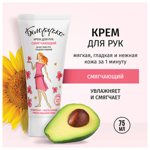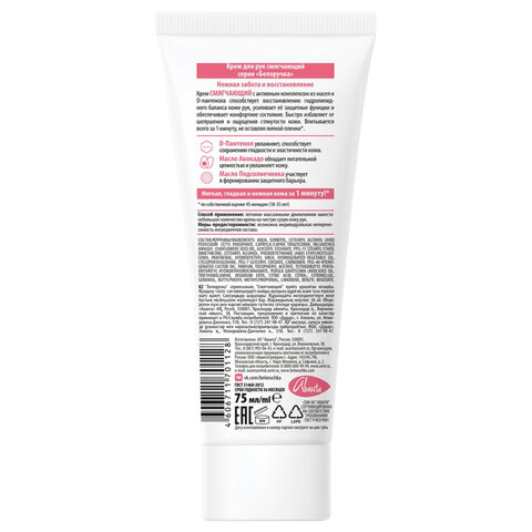 Состав: вода, сорбитол, воск эмульсионный, каприлик/каприк триглицерид, масло подсолнечное, глицерилстеарат, ппг-15 стеариловый эфир, диметикон, цетеариловый спирт, феноксиэтанол и этилгексилглицерин, d-пантенол, гидроксиэтилмочевина, жир специального назначения, циклометикон, пэг-7 глицерилкокоат, карбомер, пэг-40 гидрогенат касторового масла, ароматическая композиция,витамин е-ацетат, тетрадибутил пентаэритритил гидроксигидроциннамат, масло авокадо рафинированное, триэтаноламин, динатрий эдта, кислота лимонная, цитраль, цитронеллол, гераниол, бутилфенил метилпропиональ, лимонен, бензилбензоат. Производитель: Белоручка Тип крема: крем для рук