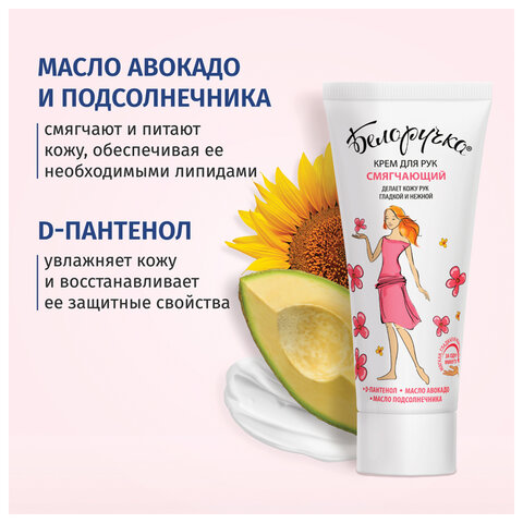 D-Пантенол увлажняет, способствует сохранению гладкости и эластичности кожи. Масло авокадо обладает питательной ценностью и увлажняет кожу. Масло подсолнечника участвует в формировании защитного барьера.